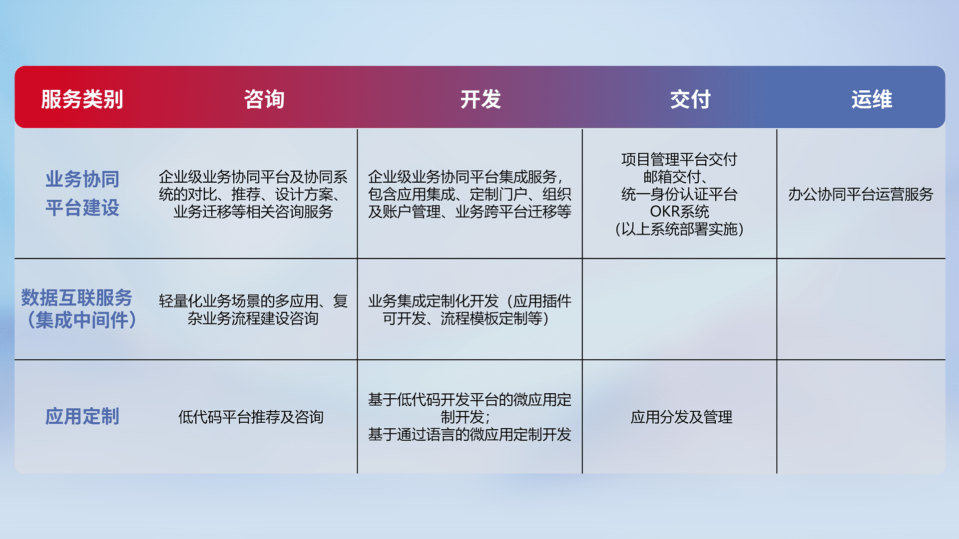 针对钉钉、、、企微、、、、IDaas等平台级产品提供产品的规划、、、、方案、、、、交付、、定制化开发等服务,,,实现如统一协同办公、、、、智能客户服务、、、、混合会议管理、、、、智能数据查询、、等业务场景,,,实现数字化转型。。。